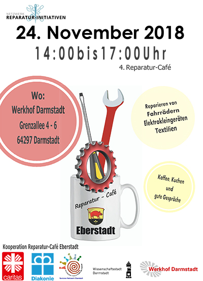 Das Reparatur-Café, eine Kooperation des Senioren Netzwerkes Eberstadt, der Stadt Darmstadt, dem Werkhof e. V. und der Stadtteilwerkstatt Eberstadt-Süd, findet in den Räumen des Werkhofs Darmstadt e.V., Grenzallee 4-6, 64297 Darmstadt, statt. Zur Unterstützung des Reparatur-Cafés sind Spenden herzlich willkommen.