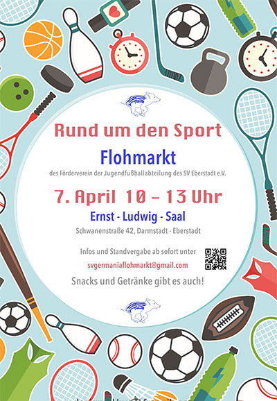 Der Förderverein der Jugendfußballabteilung des SB Germania Eberstädt lädt am 7. April zum Flohmarkt rund um den Sport ein. Von 10 bis 13 Uhr kann im Ernst-Ludwig-Saal, Schwanenstraße 42 in Eberstadt gestöbert werden. Infos und Standvergabe ab sofort unter svgermaniaflohmarkt@gmail.com. Für das leibliche Wohl ist mit Snacks und Getränken gesorgt.