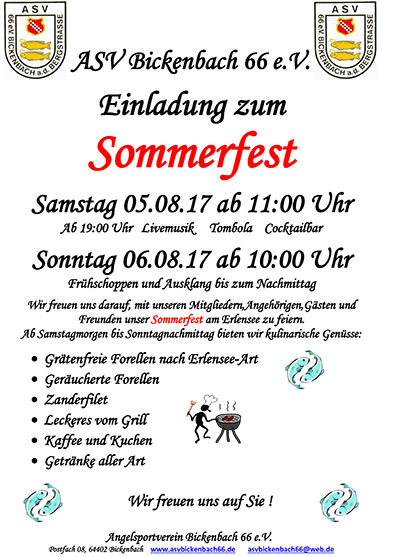 BICKENBACH, Juli 2017 (meli), Der Angelsportverein feiert ab Samstag 05. August 11:00 Uhr das traditionelle Sommerfest am Erlensee in Bickenbach. Angeboten werden kulinarische Genüsse, wie geräucherte, gebackene grätenfreie Forellen nach Erlensee-Art, Zanderfilet, Steak, Bratwurst, Pommes, Kuchen und Kaffee sowie diverse Getränke. Vor allem die grätenfreien Forellen fanden letztes Jahr großen Anklang. Samstagabend gibt es Livemusik, eine Tombola und am Sonntag lädt der ASV zu einem Frühschoppen ab 10:00 Uhr ein, gefeiert wird bis zum Ausklang am Sonntagnachmittag. Der Vorstand des ASV und seine Mitglieder freuen sich darauf viele Besucher am Sommerfest zu begrüßen zu dürfen.