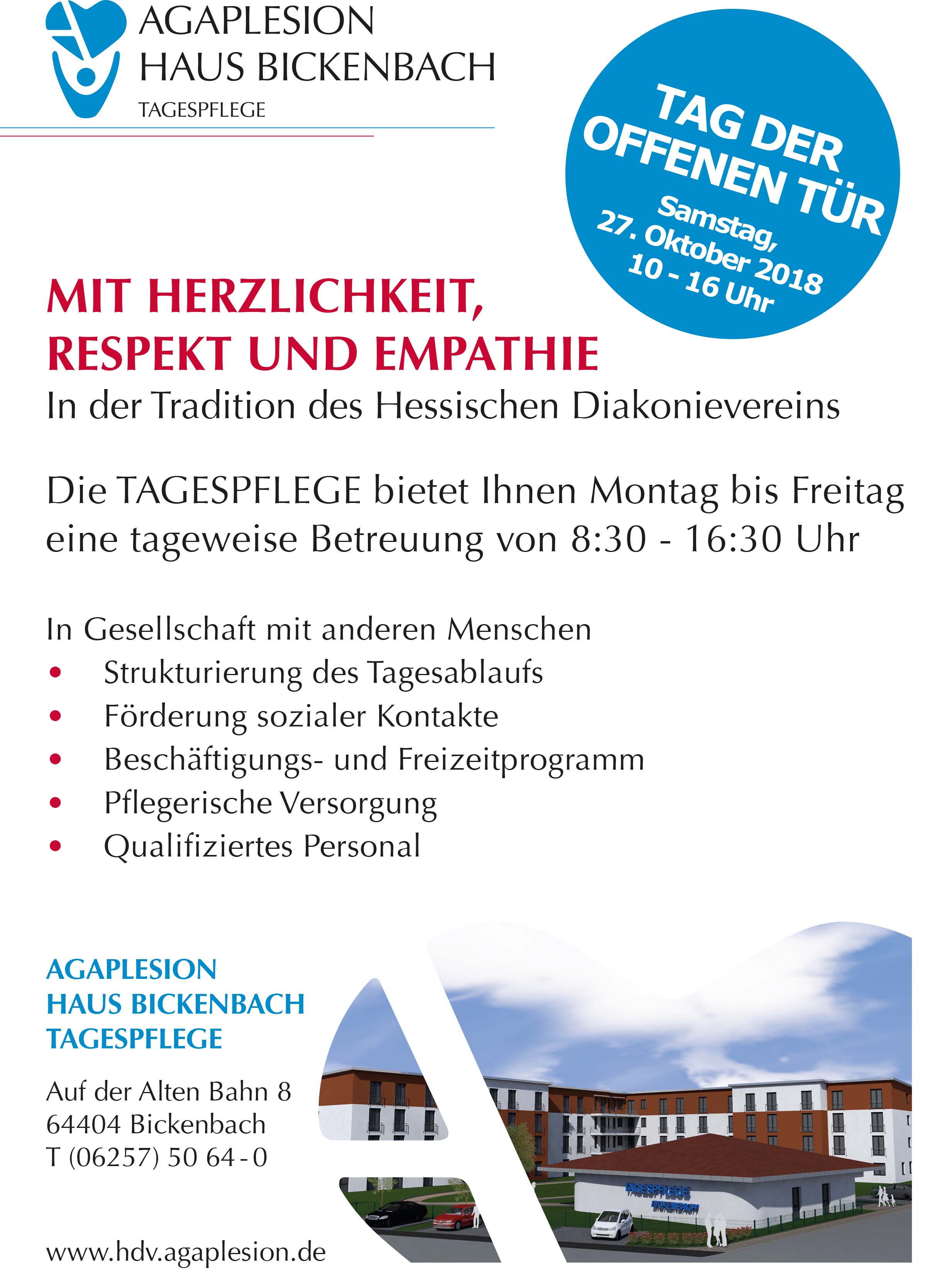 BICKENBACH, Oktober 2018 (meli), Am Samstag, den 27.10.2018, bietet das AGAPLESION Haus Bickenbach frei nach dem Motto “Mit Herzlichkeit, Respekt und Empathie” allen Interessierten einen Tag der offenen Tür. Besucher können sich von 10 – 16 Uhr rund um das Thema Tagespflege informieren.