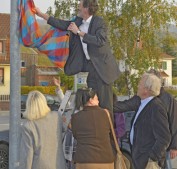 Das Straßenschild "Benno Elkan-Allee" wird von Bürgermeister Georg Rausch enthüllt.