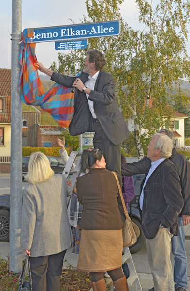 Das Straßenschild "Benno Elkan-Allee" wird von Bürgermeister Georg Rausch enthüllt.