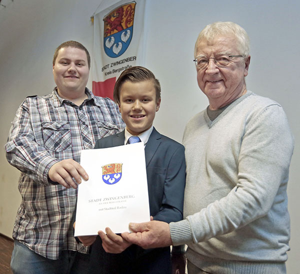 Der Nachwuchs Kart-Pilot David Wagner (mi.) vom MSC-Zwingenberg wurde für seinen 2. Platz bei der Hessenmeisterschaft von der Stadt Zwingenberg geehrt. Über den Erfolg ihres Fahrers freuen sich auch der erste Vorsitzende des MSC-Zwingenberg Alfred Guichard (re.) und Jugendleiter Lars Gußmann (li.). Foto: soe