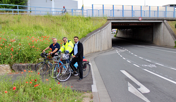 Matthias Gehrmann (ADFC) und die beiden Stadträte Andreas Born und Adil Oyan bei der Begutachtung der neuen Radverkehrsführung.