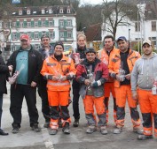 SEEHEIM-JUGENHEIM, Dezember 2014 (meli), „Eine nette Geste“ sagten die Bauarbeiter der Firma Strassing-Limes zu Bürgermeister Olaf Kühn (links). Es war eine ungewohnte Szene als der Rathauschef am Montag überraschend inmitten der Baustelle der Ortsdurchfahrt Jugenheim erschien. Er bedankte sich bei den Bauarbeitern für die gute und reibungslose Arbeit, „Sie helfen Jugenheim ein neues Gesicht zu geben“. Die Einzelhändler und Anlieger lobten die Arbeiter in den Gesprächen mit Kühn. Die Arbeiten liegen im Zeitplan. Jeder Arbeiter bekam vom Bürgermeister eine Seeheim-Jugenheim-Tasse und ein Päckchen Tee als Weihnachtsgeschenk.