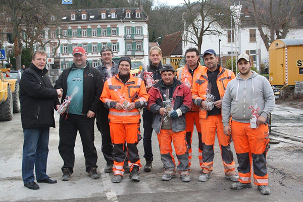 SEEHEIM-JUGENHEIM, Dezember 2014 (meli), „Eine nette Geste“ sagten die Bauarbeiter der Firma Strassing-Limes zu Bürgermeister Olaf Kühn (links). Es war eine ungewohnte Szene als der Rathauschef am Montag überraschend inmitten der Baustelle der Ortsdurchfahrt Jugenheim erschien. Er bedankte sich bei den Bauarbeitern für die gute und reibungslose Arbeit, „Sie helfen Jugenheim ein neues Gesicht zu geben“. Die Einzelhändler und Anlieger lobten die Arbeiter in den Gesprächen mit Kühn. Die Arbeiten liegen im Zeitplan. Jeder Arbeiter bekam vom Bürgermeister eine Seeheim-Jugenheim-Tasse und ein Päckchen Tee als Weihnachtsgeschenk.