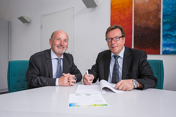 Rainer Babylon, Bereichsleiter Vertrieb/Marketing GGEW AG, und Olaf Kühn, Bürgermeister der Gemeinde Seeheim-Jugenheim (v.l.). Foto: M. Fippel