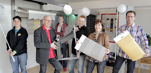 In entspannter Atmosphäre können sich interessierte Besucher ausführlich über das umfangreiche Produktsortiment und Angebot rund um Sonnenschutz und Schreinerei beraten lassen. Unser Foto zeigt (v.li.) Alejandro Berres, Thomas Gabriel, Felix Hillerich, Andreas Fix, Gerlinde Gabriel und Markus Petzer.