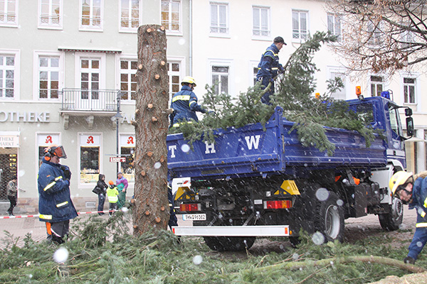 BENSHEIM, Januar 2015 (meli), Auch in diesem Jahr war es die Aufgabe des THW Ortsverband Bensheim die Weihnachtstanne auf dem Marktplatz abzubauen. Dazu fuhren am Samstag 12 Helfer mit ihren THW Geräten auf dem Marktplatz, um mit Bensheim Aktiv die Tanne abzubauen. GKW, Gabelstapler und Kipper füllten den Marktplatz und zeigten schon um 13 Uhr eindrucksvoll, dass die letzten Stunden für den schönen Baum geschlagen haben. mehr »