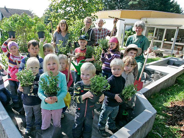 Zu bunt blühenden Naschbeetflächen haben die Kinder der Naturschutz und -erlebnisgruppe „Wühlmäuse“ zusammen mit den Kindern des Naturkindergartens Malchen der Seeheimer Kita Windrad die Wasserbecken an der Malchener Bürgerhalle umgestaltet. Foto: soe