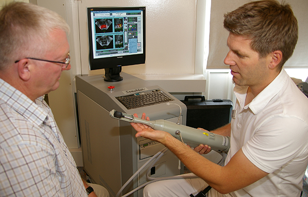 Der Urologe Dr. Martin Löhr erklärt einem Patienten die Funktionsweise der HIFU-Sonde. Foto: M. Boeckh