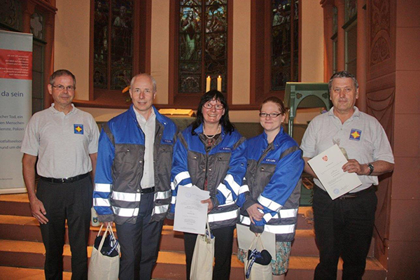 BERGSTRASSE, Juni 2016 (meli), Die Notfallseelsorge im Kreis Bergstraße hat Verstärkung bekommen. Nach sechs Monaten Ausbildung wurden fünf neue Mitarbeitende für den Dienst beauftragt. André Dykier (Birkenau) Hans-Peter Falter, Anne Kathrin Lohr (beide Heppenheim), Fabia Krenz (Biblis) und Hermann Waßmuth (Seeheim-Jugenheim) leisten ab sofort Erste Hilfe für die Seele. mehr »