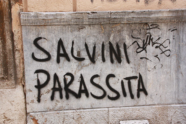 „Salvini Schmarotzer“- Graffiti an einer Hauswand in Palermo. Kritiker werfen dem italienischen Innenminister vor, Stimmung gegen Flüchtlinge zu machen und davon politisch zu profitieren.