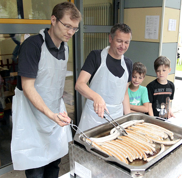 Mit leckeren Grillwürstchen und Kaffee und Kuchen war für das leibliche Wohl bestens gesorgt. Sebastian Bubenzer (li.) grillte unter den aufmerksamen Blicken der Jüngsten. Foto: S. Oelsner