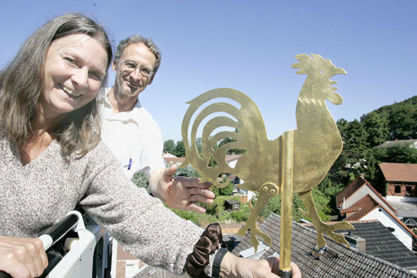 Über ihren neu restaurierten Wetterhahn freuen sich Küsterin Jutta Schiliro und Michael Maxin.