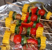 BERGSTRASSE, Juli 2013 (meli), In der Glut gegarte Kartoffeln, gegrillte Brotscheiben mit Kräuter- und Tomatenbutter, Pilze, Schafskäse, Gemüsespieße, Maultaschen mit Gemüsesäckchen und als Nachtisch mit Balsamico-Essig und Honig bestrichene Nektarinen sowie mit Karamelsahne übergossene Ananas – ebenfalls frisch vom Holzkohlengrill. mehr »