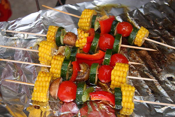 BERGSTRASSE, Juli 2013 (meli), In der Glut gegarte Kartoffeln, gegrillte Brotscheiben mit Kräuter- und Tomatenbutter, Pilze, Schafskäse, Gemüsespieße, Maultaschen mit Gemüsesäckchen und als Nachtisch mit Balsamico-Essig und Honig bestrichene Nektarinen sowie mit Karamelsahne übergossene Ananas – ebenfalls frisch vom Holzkohlengrill. mehr »