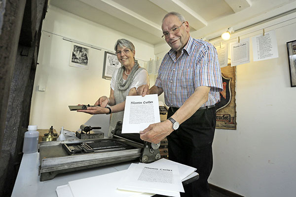 Den Buchdruck als Handwerk präsentierten Renate und Bernd Knodel an der Abziehpresse im Museum Bickenbach. Foto: soe