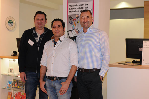 Geschäftsführer von „Mobile Welt“ Thorsten Pfeiffer (rechts) und Fillalleiter Markus Kahl (links) freuen sich über die Zusammenarbeit mit Dr. Ing. Michael Samman (Geschäftsführer von „Doc Phone“).
