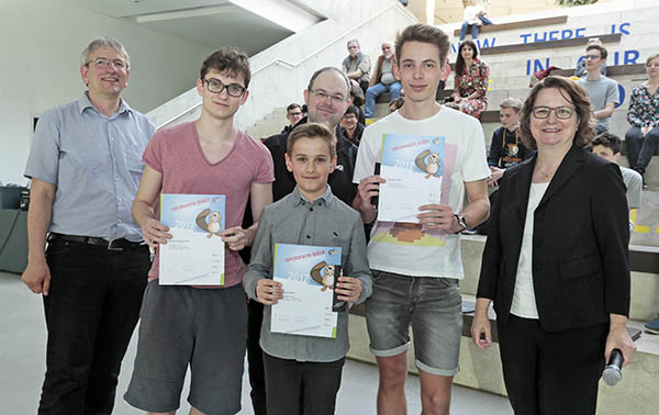 ür ihre ersten und zweiten Plätze beim bundesweiten Wettbewerb Informatik dem „Informatik-Bieber“ wurden David Immanuel Kiehl, Dorian Schulz und Bendikt Gros (v.li.) ausgezeichnt. Foto: soe