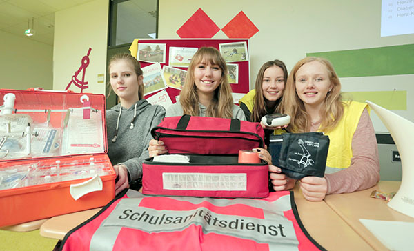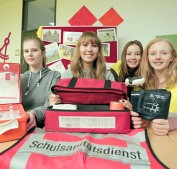 Über den Sanitätsdienst und ihre Tätigkeit als Schulsanitäter informierten Nadine Andiel, Constanze Schneider, Helen David und Marlene Selzer (v.li.) an ihrem Stand. Foto: soe