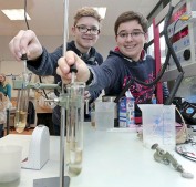 Ihr Experiment zur Eisennachweisreaktion, mit dem sie am Wettbewerb „Jugend forscht“ teilnehmen, präsentierten und erklärten Arne Buhmann und Thanos Drossos den Besuchern. Foto: soe