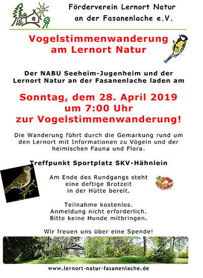 ALSBACH-HÄHNLEIN, April 2019 (meli), Der NABU Seeheim-Jugenheim und der Lernort Natur an der Fasanenlache laden am Sonntag, dem 28. April 2019 um 7:00 Uhr zur Vogelstimmenwanderung ein! Die Wanderung führt durch die Gemarkung rund um den Lernort mit Informationen zu Vögeln und der heimischen Fauna und Flora. Treffpunkt ist am Sportplatz SKV-Hähnlein. Am Ende des Rundgangs steht eine deftige Brotzeit in der Hütte bereit. Die Teilnahme kostenlos. Eine Anmeldung nicht erforderlich. Bitte keine Hunde mitbringen. Der Verein freut sich über eine Spende!