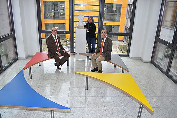 Helmut Kellermann, Vorsitzender des Fördervereins, Ute Ritter, kreative Lehrerin und Jürgen Mescher, Schulleiter des Goethe-Gymnasiums (v.l.) freuen sich über die gelungene Neugestaltung des Foyers.