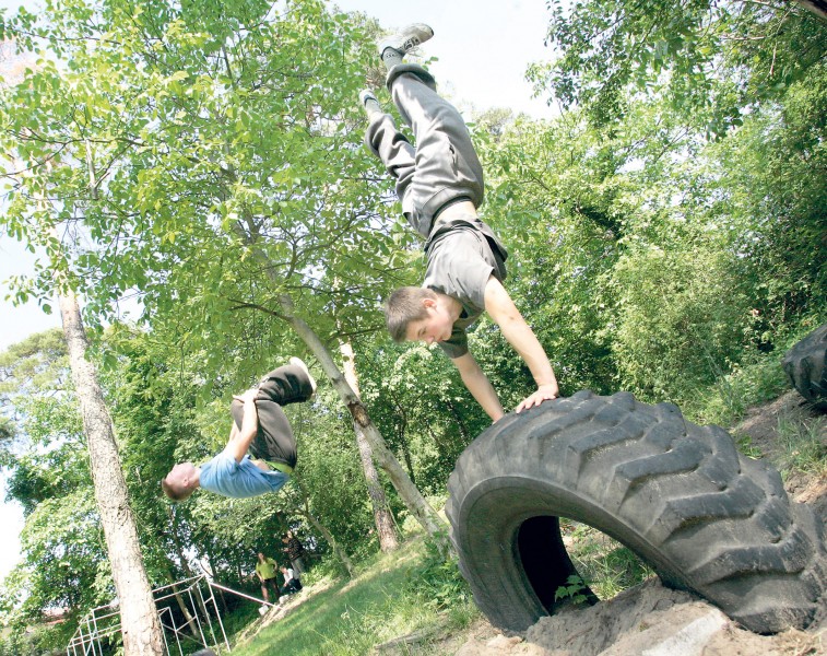 Eine Vorführung des Extremsports "Parkour" mit waghalsigen Tricks über verschiedene Hindernisse präsentierten zwei Mitglieder der Parkourgruppe "Yonetsu" in ihrem selbsterrichteten Park am Seeheimer Jugendtreff.