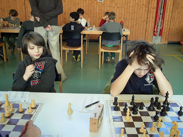 Leon Bär und Tobias Kühner "brüten" über dem nächsten Schachzug.