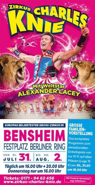 BENSHEIM, Juni 2018 (meli), Der in Monte Carlo im Jahre 2017 preisgekrönteZirkus Charles Knie kommt zu einem Gastspiel in unsere Stadt und gastiert vom 31. Juli bis 2. August auf dem Festplatz Berliner Ring in Bensheim.